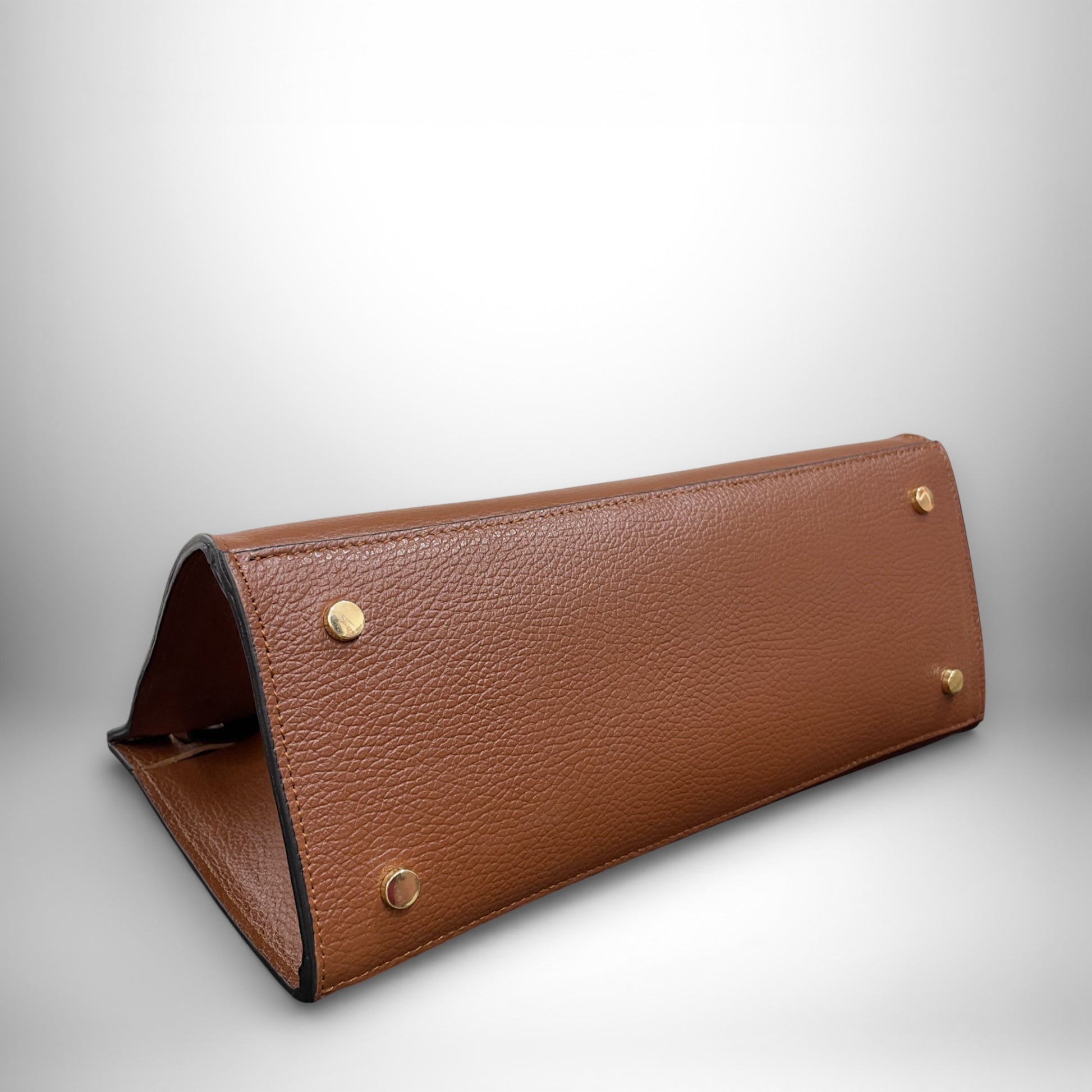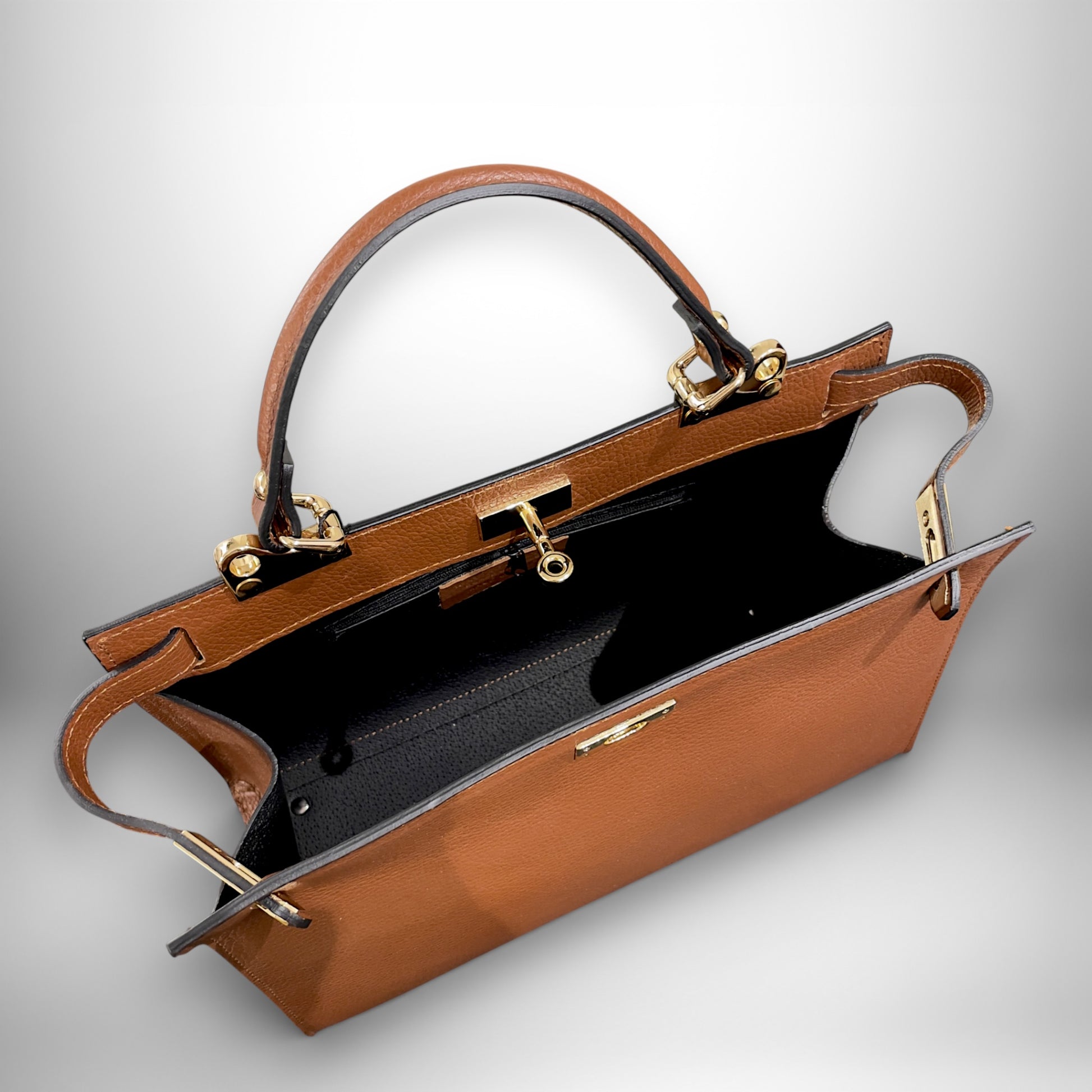 La sua struttura definita e il colore cuoio donano un aspetto raffinato e senza tempo, mentre i dettagli in metallo dorato aggiungono un tocco luminoso e femminile. Può essere portata a mano per un look più elegante oppure a tracolla per una maggiore libertà di movimento.