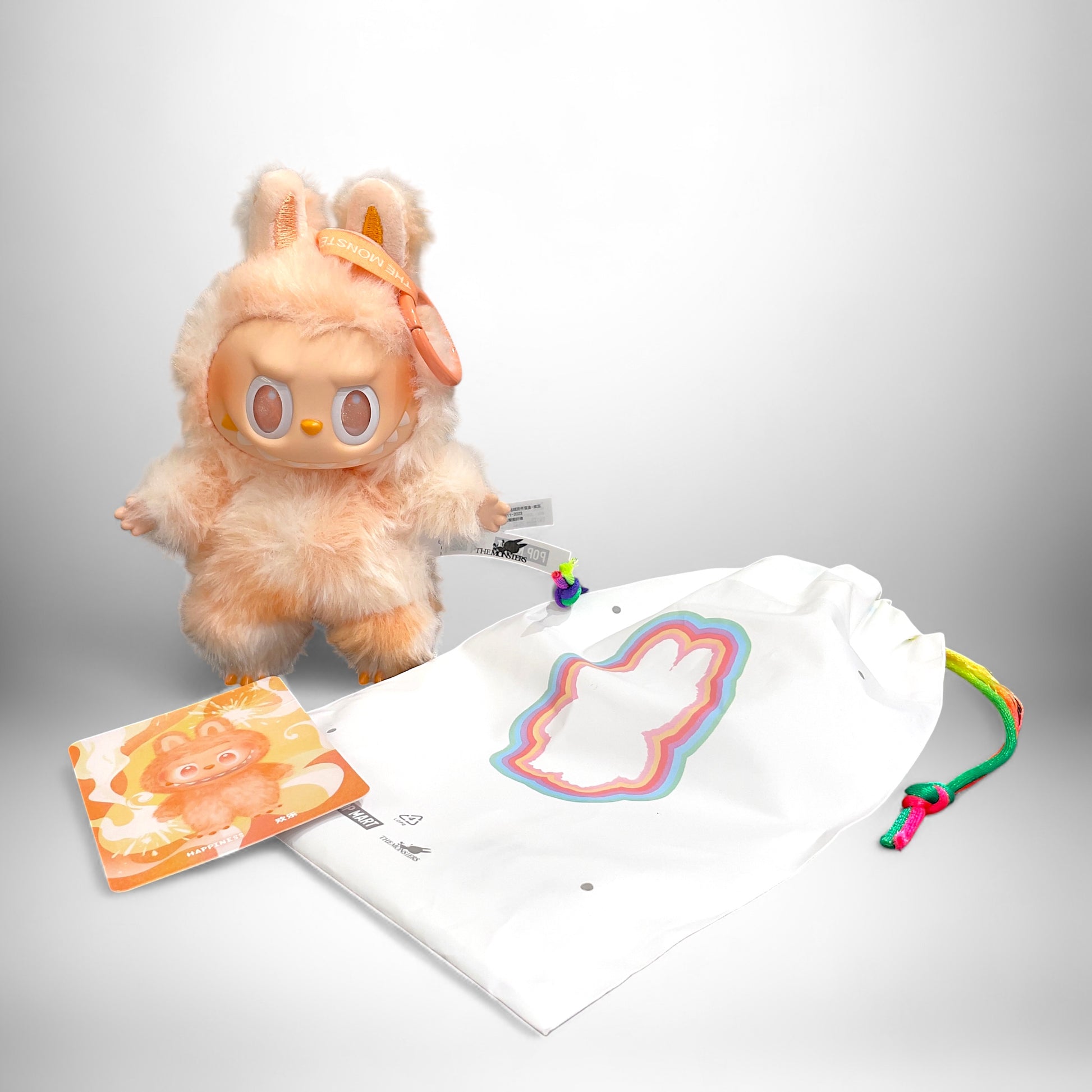Realizzato in morbido peluche con dettagli in vinile, è perfetto come oggetto da collezione o come piccolo dono pieno di significato. Grazie alla pratica clip, puoi agganciare Labubu Happiness a borse, zaini o portachiavi, aggiungendo un tocco kawaii e colorato al tuo stile quotidiano.
